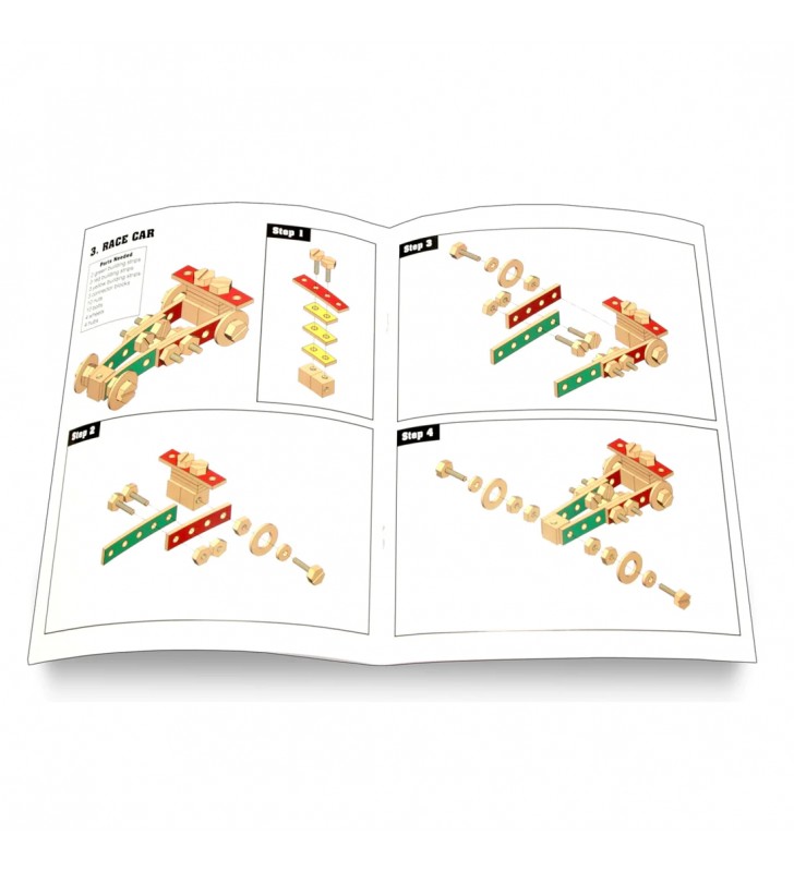 55 peças para construção (Porcas e Parafusos em madeira) e manual com projeto de 6 modelos.